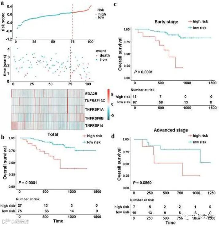 与此同时,为了评估这个五基因标签预测临床 LUAD 患者 OS 的稳健性,我们使用 qRT-PCR 在包括102个 LUAD 冷冻组织样品的独立队列中进一步验证了基于 TNF 家族的标签。使用相同的公式,根据最佳截断点将患者分为两组(图3a)。结果,高危组和低危组之间的死亡率显着不同(图3b)。对早期和晚期 LUAD 患者进行分层分析,以评估签名的预后意义。结果证实,签名可以将患者分为高风险组和低风险组,OS 结果显着不同(图3c和d)。通过风险评分、生存率以及用Kaplan-Meier分析方法做总生存曲线,验证了TNF家族标记分子的预后表现。