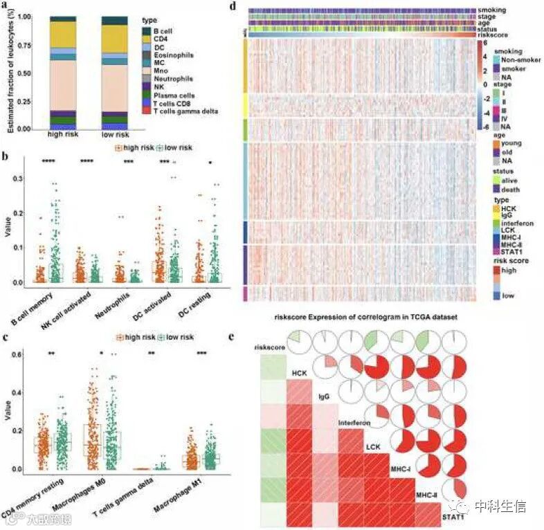 为了更好地理解与风险评分相关的炎症活动,我们检查了七组元基因之间的关系。这些差异代表不同的炎症和免疫反应。探索了基于 TNF 家族的标记,并且这些 metagene 的细节显示在图5(d)中。为了验证在表达细节中发现的结果,使用基因组变异分析(GSVA)来模拟7个 metagenes 的相应簇的结果。研究结果显示,风险评分与 HCK,LCK,MHC _I 和 MHC _ II呈负相关(图5e)。