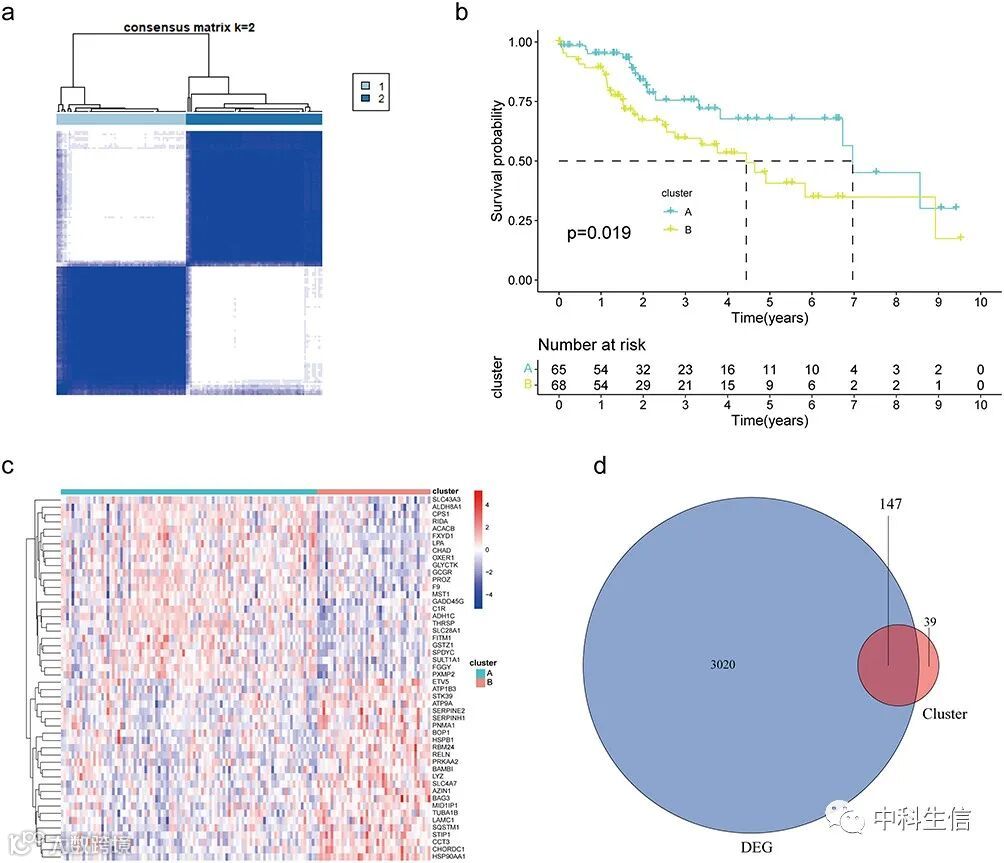 基于ICD相关生物标志物的表达,使用ConsensusClusterPlus包聚类分析135例NCHCC样本,利用limma鉴定不同簇间DEGs; -