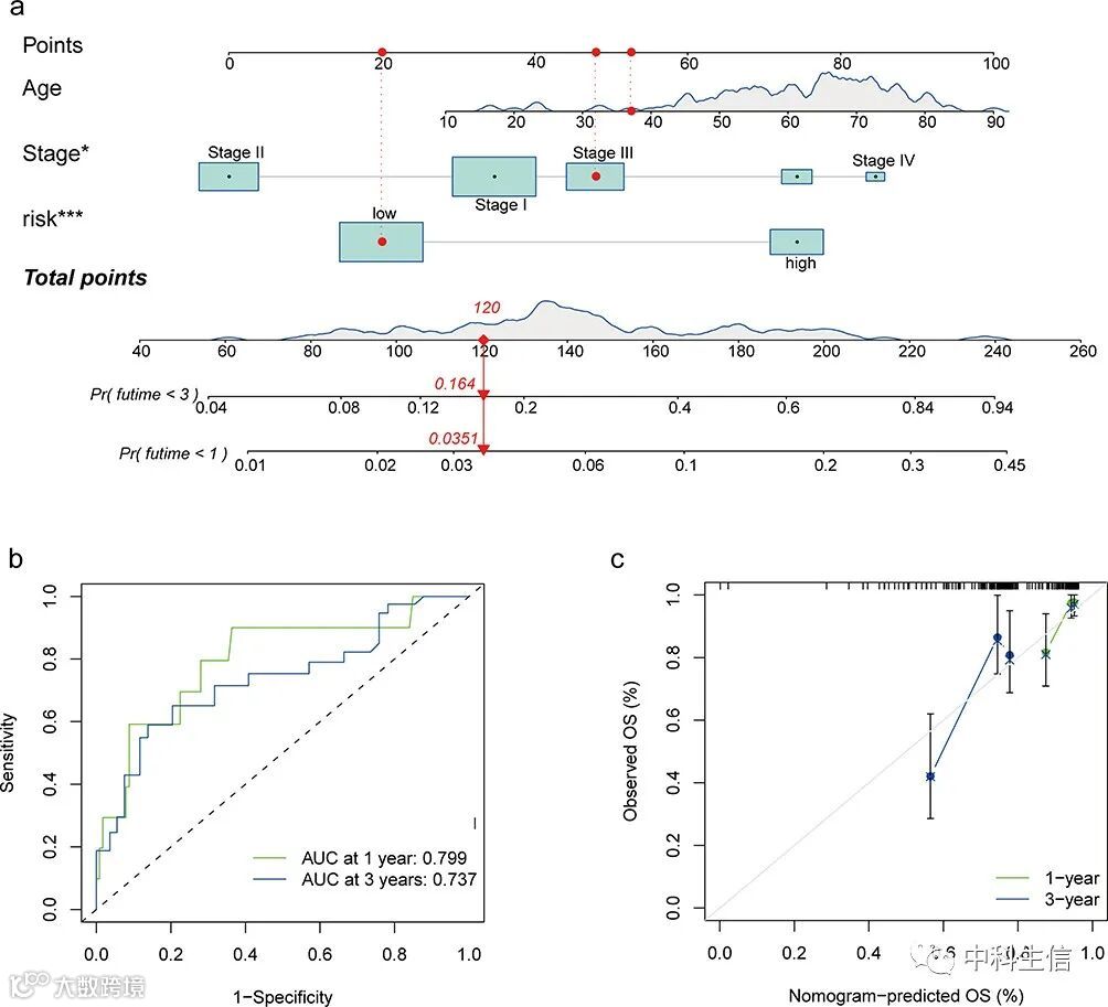 构建列线图,并使用“timeROC”和“rmda”R包绘制ROC曲线和校准曲线,以评估nomogram诊断价值; -