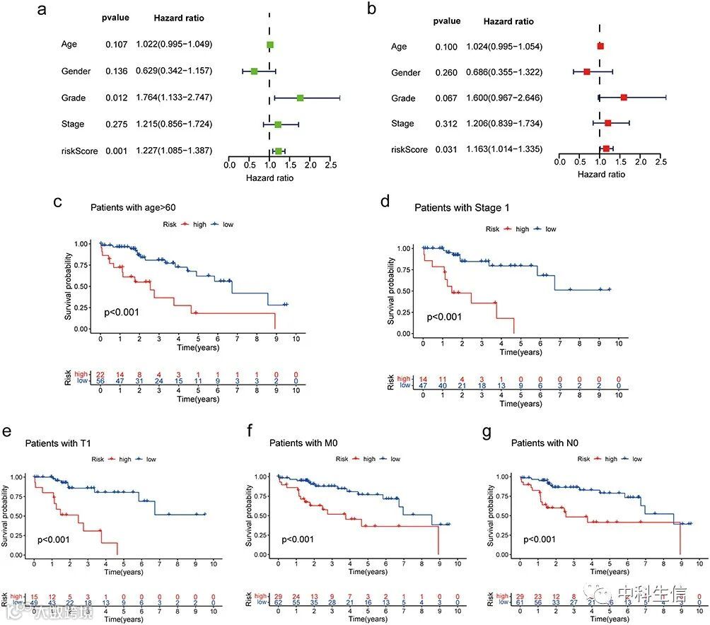 利用单变量和多变量COX分析构建预后模型,并绘制K-M和ROC曲线; -