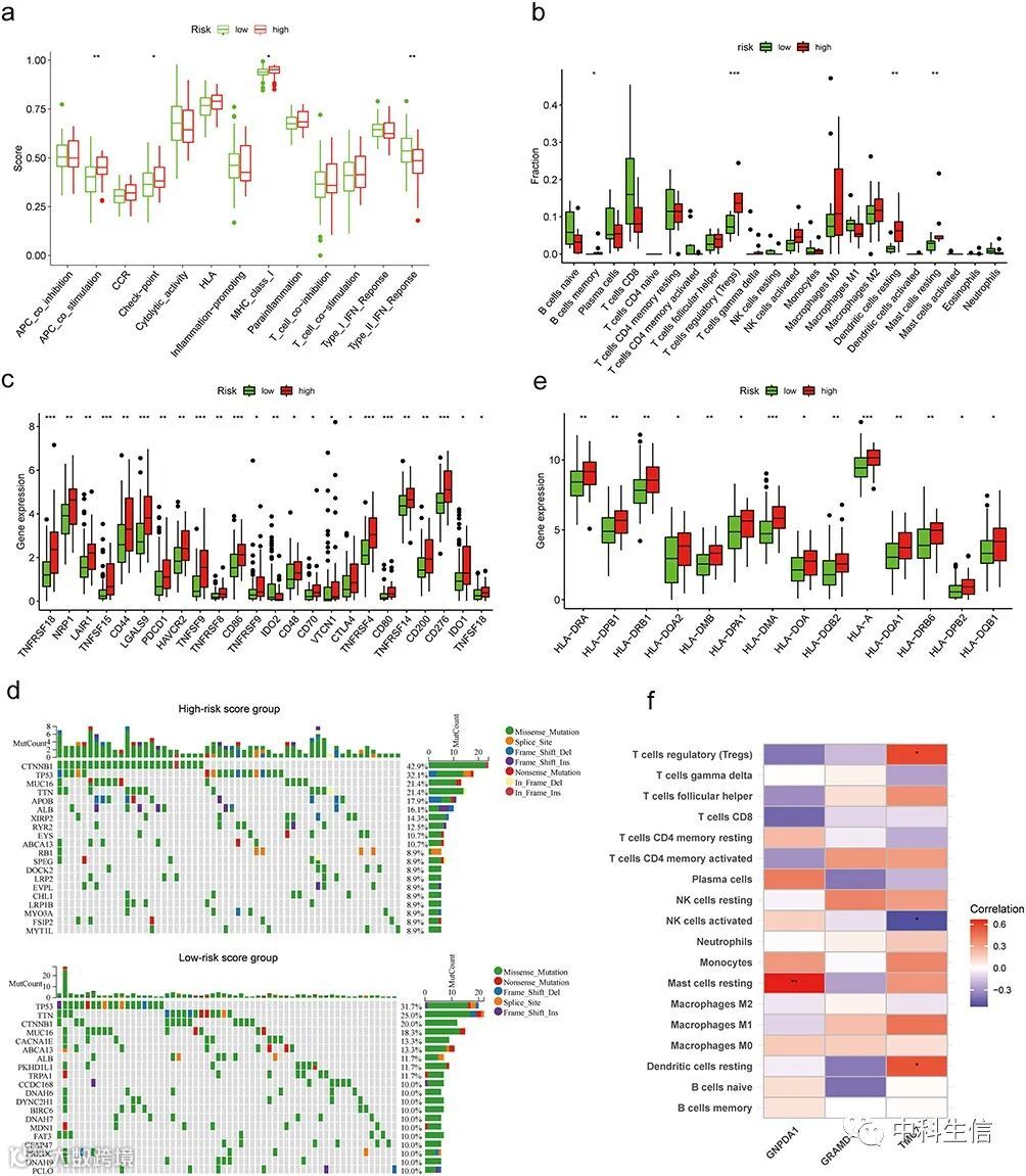 采用“GSVA”R包单样本基因集富集分析(ssGSEA)算法评估每位患者的免疫功能评分,并检测两组免疫检查点的表达情况。使用“reshape2”评估风险评分与免疫检查点之间的相关性,采用CIBERSORT算法评估不同风险组免疫浸润细胞的占比,采用“maftools”分析和可视化基因组数据; -