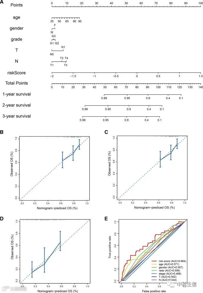 建立了一个结合年龄、性别、N、T和风险评分的列线图,可用于准确预测PAAD患者的OS。