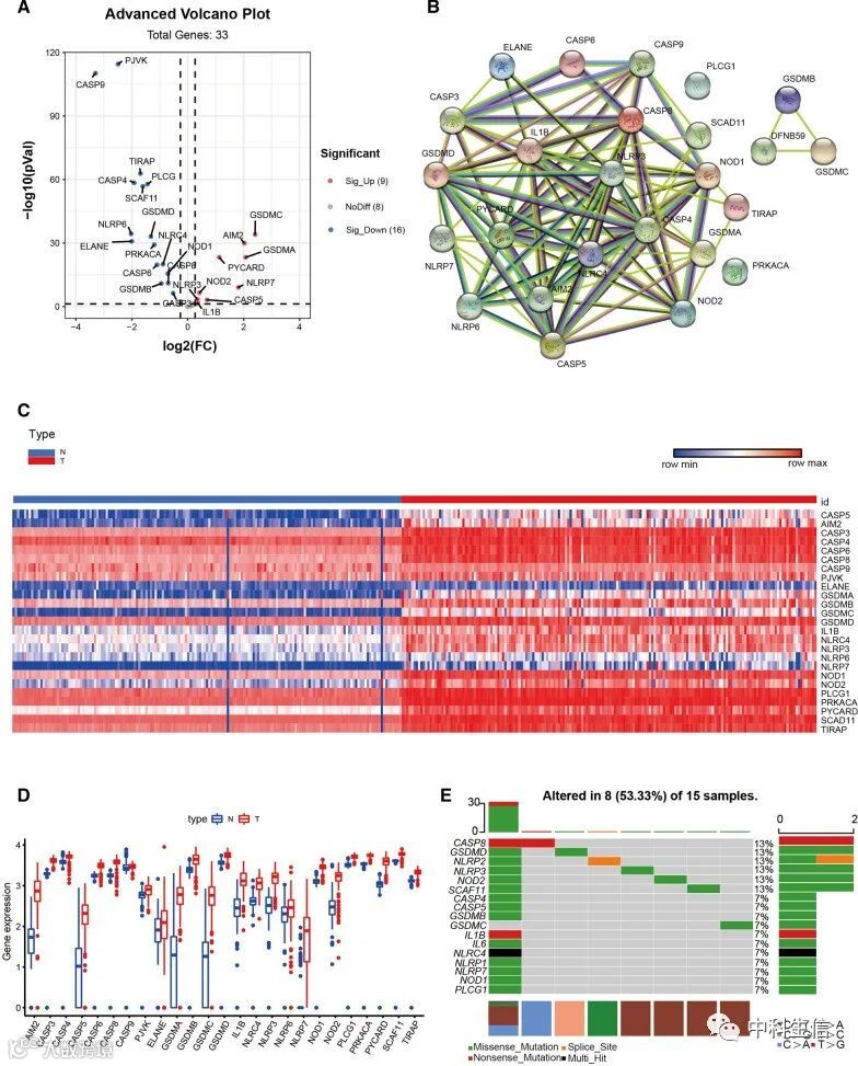 “DESeq2”包用于鉴定178个PAAD样本和167个正常样本中差异表达的焦亡相关基因。构建蛋白质-蛋白质相互作用(PPI)网络显示了焦亡相关基因的相互作用。展示差异表达焦亡相关基因的热图和箱线图。TCGA队列中观察到许多差异表达焦亡相关基因的突变。