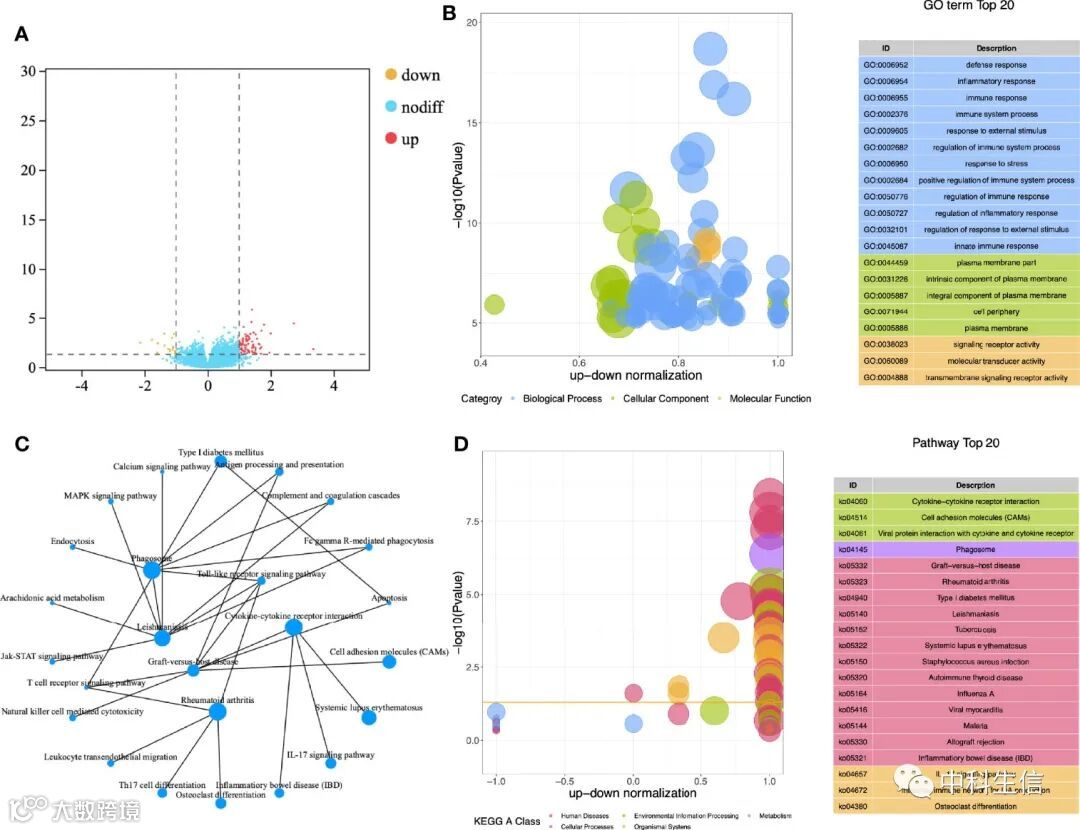 本研究共纳入了112名受试者(包括32个CE和72个非CE)。在计算得到基因表达矩阵之后,利用DESeq2包,以log2FC>1和p <0.05作为阈值筛选差异基因(图1A)。GO和KEGG功能富集分析显示,DEGs主要富集在免疫和炎症相关的功能(图1B)。图1D显示了富集程度最高的20条通路,图1C描述了这些通路的相互作用网络。大多数通路与子宫内膜的炎症和免疫过程有关。