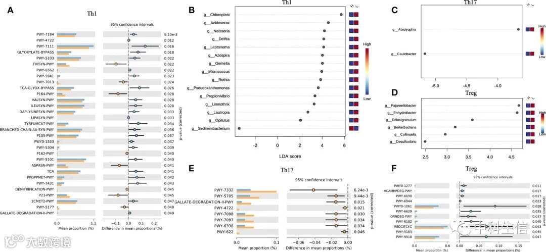 在宿主通路分析中,T细胞相关信号通路占据重要位置。利用ImmuCellAI计算18种T细胞亚型的丰度后,我们分析了在其他研究中报道的几种亚型的相关属,包括Th1, Th17和T regular (Treg)(图5)。Th1丰度高的患者子宫内膜菌群(图5B)在几个糖酵解相关的途径中都是活跃的,包括硫胺素二磷酸生物合成超通路I (thissyn - pwy),还原TCA循环I (P23-PWY),l -天冬氨酸和l -天冬酰胺生物合成(ASPASN-PWY)和嘌呤碱基降解的通路I (P164-PWY)(图5A)。PWY-7332通路在Th17丰度高的患者子宫内膜中高度活跃,是合成脂多糖(LPS)的通路,脂多糖是一种重要的免疫调节剂(图5C, E)。