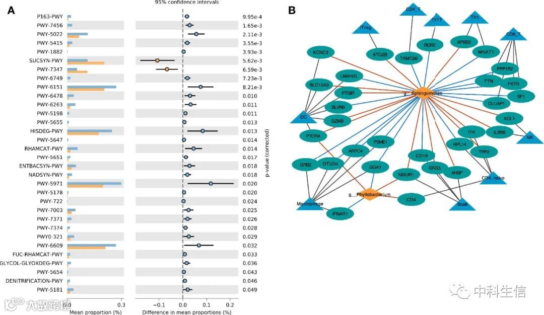 免疫细胞的标记基因来自先前的研究。选择的属与免疫细胞标记基因通过Spearman分析构建相关网络(图4B)。作者发现,Phyllobacterium和Sphingomonas与免疫细胞的关系相似,主要与树突状细胞(DC)、自然杀伤细胞(NK)、iTreg细胞和B细胞呈正相关。这两个属与巨噬细胞呈负相关。
