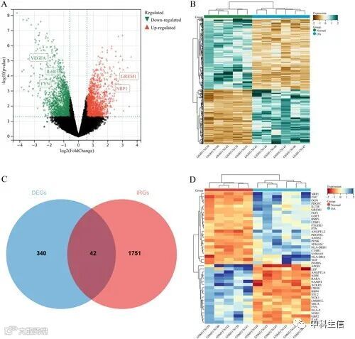 在GSE169077数据集中,在OA和正常组织之间共筛选出382个DEG,包括OA样本中的166个上调基因和216个下调基因(图 3A、B)。同时,从ImmPort数据库中检索到1,793个免疫相关基因。通过将382个DEG与1,793个免疫相关基因取交集(图 3C-D),获得了42个IODEG,包括23个上调基因和19个下调基因。