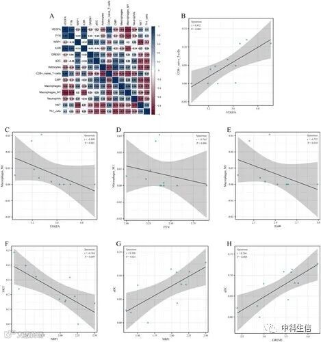 分析了5种候选诊断生物标志物(VEGFA、FYN、GREM1、NRP1和IL6R)与9种差异浸润免疫细胞类型(aDC、星形胶质细胞、CD8+ naïve T细胞、CMP、巨噬细胞、巨噬细胞M1、中性粒细胞、NKT和Th1细胞)之间的关系,并通过 r > 0.70 和 p < 0.05 确定了显著的关系对(图 10A)。VEGFA与CD8+ naïve T细胞呈显著正相关(r = 0.852,p < 0.001)(图10B),而VEGFA(r = −0.840,p = 0.001)、FYN(r = −0.765,p =0 .006)和IL6R(r = −0.732,p =0 .010)与巨噬细胞M1( 图 10C-E)。此外,NRP1与NKT呈负相关(r = −0.764,p =0 .009)(图10F),而NRP1 (r = 0.700, p = 0.021) 和 GREM1 (r = 0.764, p = 0.009) 与 aDC正相关(图 10G,10H)。