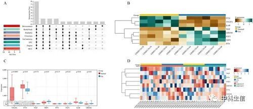 使用R包“UpSet”进一步筛选得到8个Hub基因,包括VEGFA,FYN和IL6R,它们在OA中显示下调表达,以及NGF,PTN,FGF1,NRP1和GREM1显示上调表达。它们在GSE169077微阵列数据集中的表达可视化为热图(图 8A,8B)。8个Hub基因的表达在GSE55235和GSE55457数据集中得到验证,并可视化为箱线图和热图(图 8C,8D)。一致的是,VEGFA、FYN 和IL6R在OA 组织中的表达显著低于正常组织,而NRP1 和GREM1在OA组织中的表达率相反地显著更高。可以推断,VEGFA、FYN、IL6R、NRP1和GREM1可作为OA诊断的候选生物标志物。