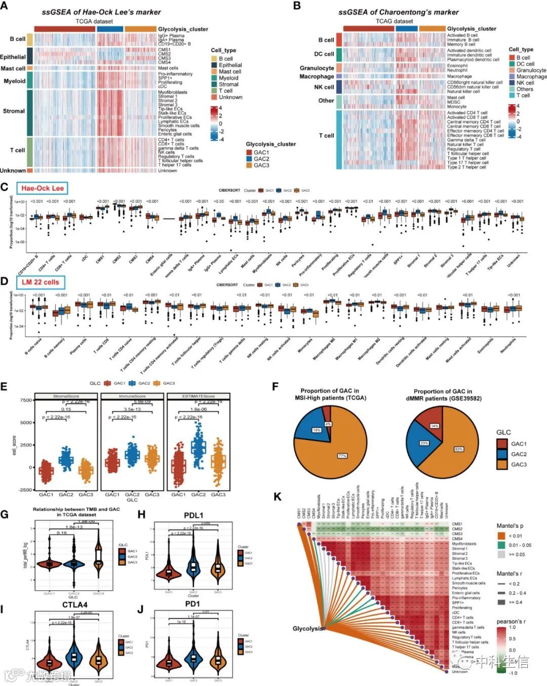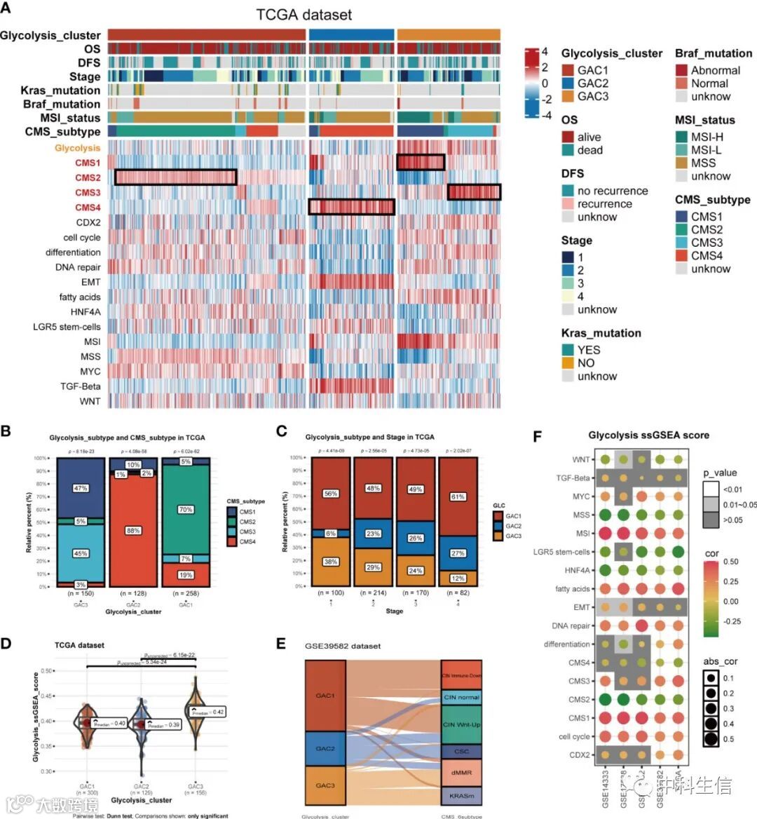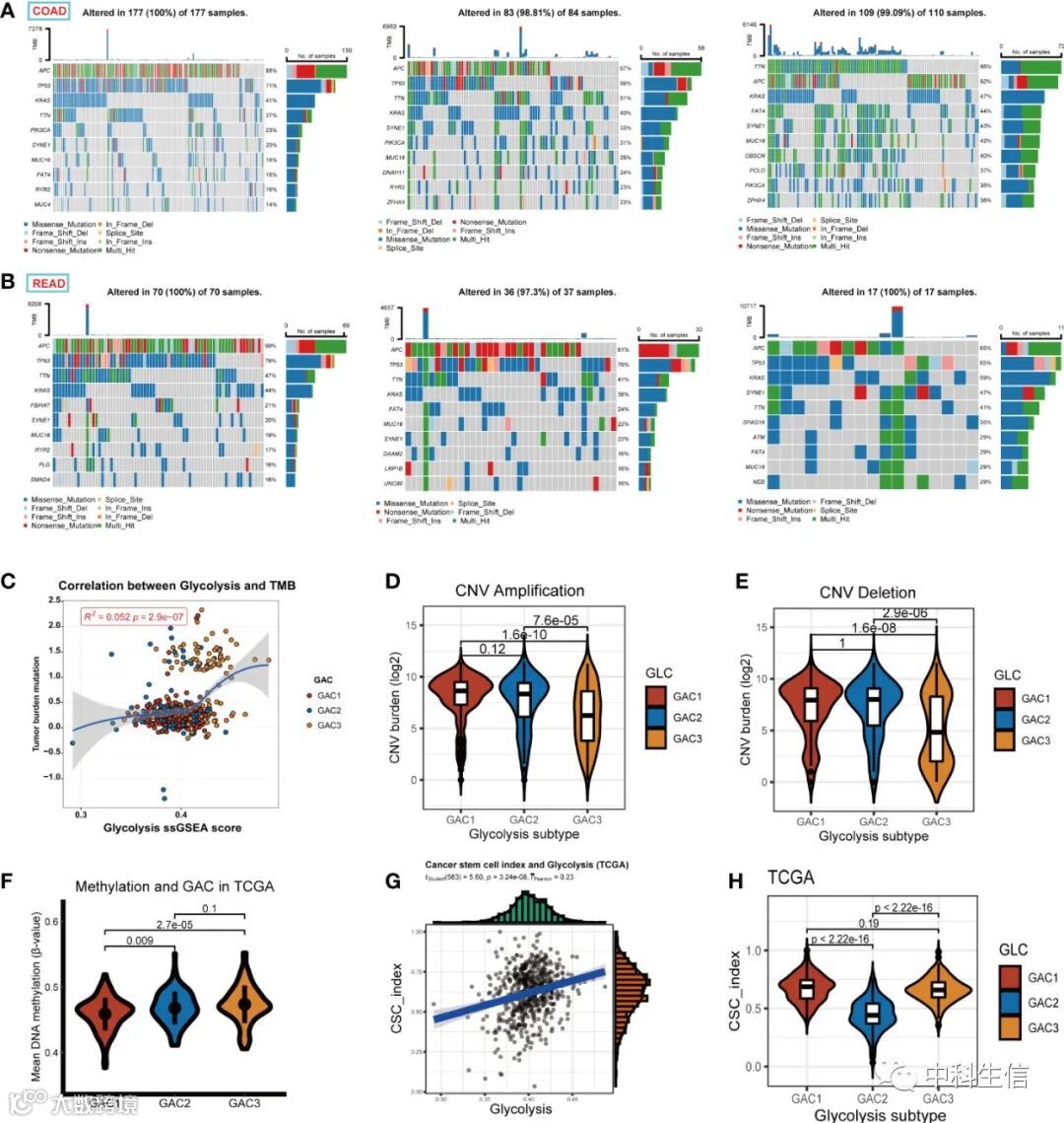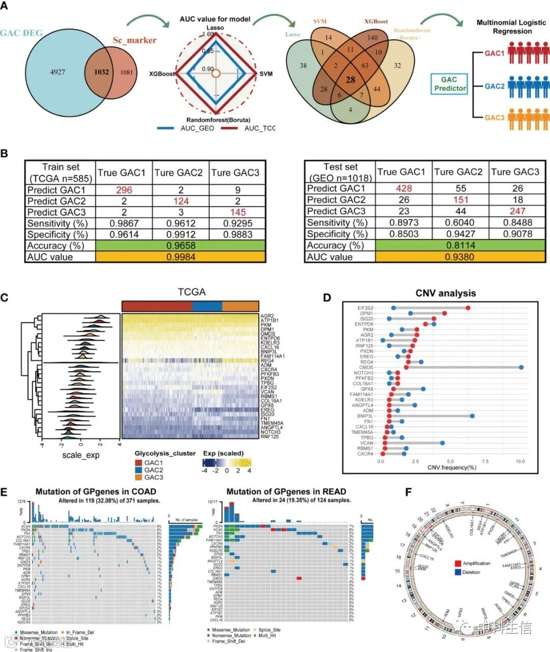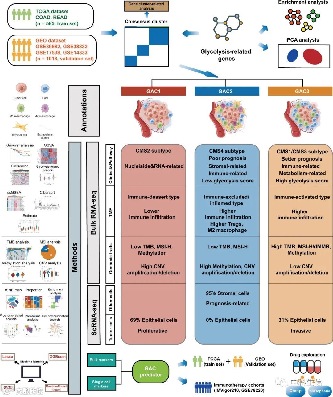大家晚上好!今天小编和大家分享一篇23年5月发表在(IF:7.300)杂志的文章《Machine learning-based glycolysis-associated molecular classification reveals differences in prognosis, TME, and immunotherapy for colorectal cancer patients》。作者通过共识聚类以及机器学习等方法,系统性地分析了糖酵解相关分子在结直肠癌患者中的突变、生存以及肿瘤微环境之间的关联。对于糖酵解相关方向的分析思路有兴趣的老师可以与我们联系,方法适用于其他分子。 背景糖酵解是能量转化的关键形式,将葡萄糖转化为丙酮酸,最终产生乳酸并为肿瘤细胞提供氧非依赖性能量。即使在有氧环境中,肿瘤细胞仍然可以限制糖酵解的能量代谢,通常称为需氧糖酵解。通过减少细胞抑制和凋亡,糖酵解为肿瘤细胞生长创造条件。越来越多的证据表明,糖酵解与结直肠癌的发展有关。许多糖酵解相关基因,包括乳酸、GLUT1、丙酮酸激酶M2、甘油醛-3-磷酸脱氢酶、烯醇化酶-1、乳酸脱氢酶5和己糖激酶2,目前被发现在结直肠癌中上调。同时也有证据表明,糖酵解对于控制肿瘤细胞与肿瘤微环境(TME)之间的相互作用至关重要。在这项研究中,作者使用无监督聚类方法使用糖酵解相关的基因对每个CRC患者进行分类。然后讨论了每个糖酵解相关簇(GAC)的临床、基因组学、TME和富集途径的特征。同时还将每种GAC类型映射到单细胞数据,分析了每个细胞中每种GAC样亚型的分布和功能。基于上述发现,作者整合了单细胞和普通RNA-seq的结果,以开发一个模型来预测每个CRC患者的GAC并对其进行验证,并探索了其在治疗中的作用。 方法1,k-means方法和ConsensusClusterPlus包进行了共识聚类;2,survival and survminer包进行Kaplan-Meier生存分析;3,GSVA包探索每个GAC富集的途径;4,CMScaller包确定CRC患者的CMS归类;5,Seurat包对scRNA-seq数据进行处理;6,metafor包中的rma功能确定重要的细胞亚型;7,monocle3包进行拟时序分析;8,glmnet,randomForest,Boruta,XGBoost,e1071和caret包筛选重要基因;9,pROC和caret包计算ROC曲线下的AUC面积;10,pRRophetic包计算药物的半抑制浓度(IC50)值。 技术路线