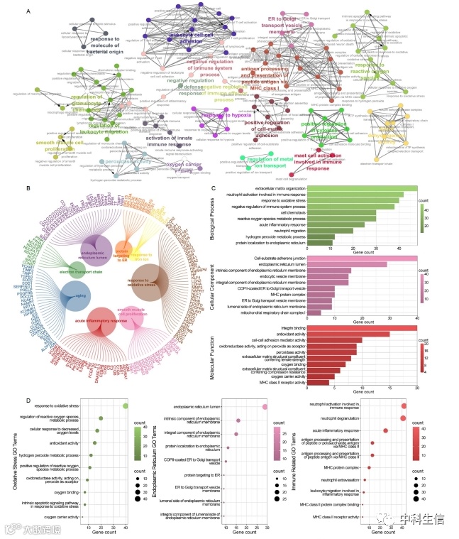 POAG中的功能相关性分析。为探索与POAG相关的潜在生物过程,利用R包cluster profiler和Cytoscape中的ClueGO插件基于DEGs进行了通路富集分析。结果显示POAG中免疫相关通路、氧化应激和内质网(ER)应激显著富集。GO分析(生物过程、分子功能和细胞成分)显示最重要的途径包括:中性粒细胞激活参与免疫反应,氧化应激反应,免疫系统过程的负调控,急性炎症反应,蛋白质定位ER,内质网腔,ER膜的组成部分,抗氧化活性和MHC受体