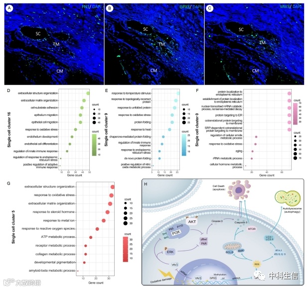Hub基因表达分析和功能富集分析。簇16显示FN1的表达显著升高。GPX3在0、2、4和5-9个簇中均有高表达。簇9显示了VAV3的高表达。cadaver眼的角巩膜组织的免疫荧光检测显示,FN1、GPX3和VAV3蛋白均在小梁网中表达(图6A-C)。GO/KEGG收集的功能富集分析表明,聚类0、5、9和16与涉及内质网应激反应、先天免疫反应调节和氧化应激反应的特征相关。