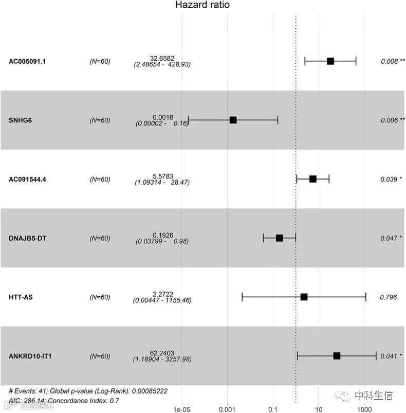 差异分析共发现466个下调和623个上调lncRNA。在 MetS 相关的4个 模块(MEgrey、MEblue、MEbrown 和 MEturquoise)中提取模块基因,使用单变量 Cox回归最终筛选到42个预后相关的lncRNA。 最后,通过多变量Cox回归分析确定了6个与预后显著相关的lncRNA(图 5)。