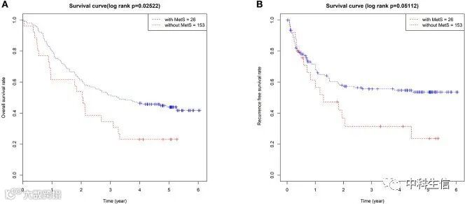 根据MetS对179名ESCC患者进行了划分。26例(14.5%)符合MetS标准,153例(85.5%)不符合标准。两组患者在生存时间和RFS上都具有显著性差异(图1A,B)。在性别、TNM分期或其他临床特征没有差异。