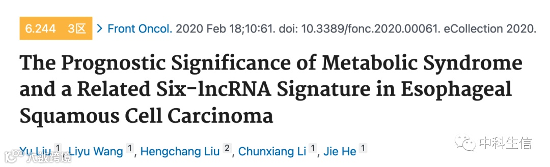 早上好,代谢相关研究方向想必大家都耳熟能详了,但是之前的研究都主要聚焦在代谢相关基因或是相关通路,没有对代谢相关指标进行系统性的研究,今天小编分享的一篇2020年2月发表在Frontiers in Oncology(IF:6.244)的文章。作者将代谢综合征(MetS)和食管鳞癌(ESCC)联系到也一起,这里对代谢综合征做个简单的科普,符合一下这些指标BMI>28,甘油三酯>150mg/dl,胆固醇<40mg/dl,空腹血糖≥110mg/dl,血压≥130mmHg,即为代谢综合征,发现了6个lncRNA与两种疾病显著相关,并对ESCC的预后具有重要影响。