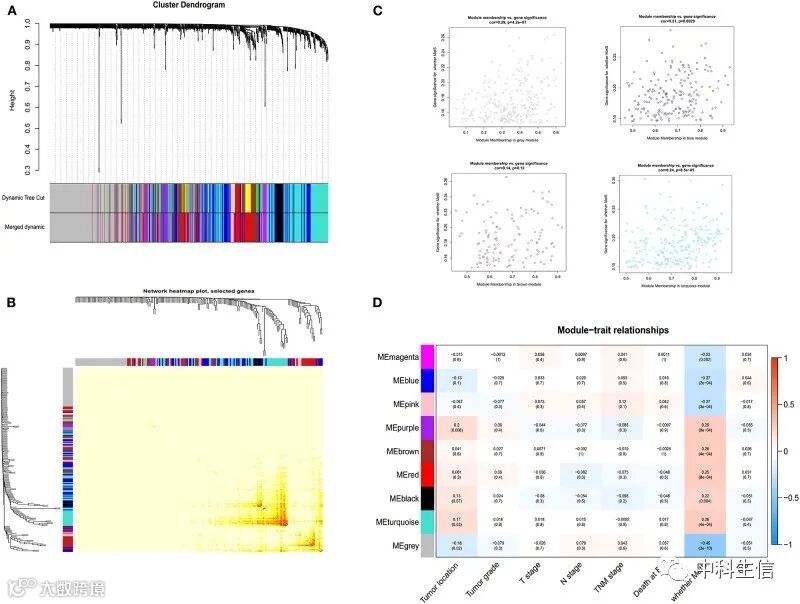 从MSigDB中下载MetS相关基因集并比较这些基因在MetS组和非MetS组间的表达差异,结果表明,IGF1,IGFALS,CSF1,TGFβ1和TGFβ2等基因在两组之间具有显著差异(图2A)。WGCNA用于筛选MetS相关的模块,最终筛选出MEgrey,MEsalmon,MEgreenyellow和MEpurple4个模块。作者模块基因显著富集到细胞外基质相关通路(图 2B)。构建了top50的hub基因的PPI网络(图 2D,E)。这些结果表明,MetS对肿瘤预后的影响可能与肿瘤微环境有关。