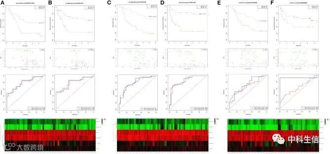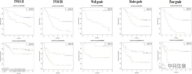 为了验证这6个lncRNA的在其他独立预后影响因素上是否具有显著差异,作者在GSE53624和GSE53622这两个数据集中比较这6个特征lncRNA的生存时间是否具有显著差异,结果显示在这6个lncRNA在TNM分期和肿瘤分级上都具有显著的OS差异(图 7).