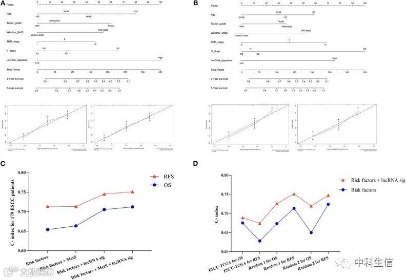 接下来,作者选择了MetS,lncRNA特征,年龄,肿瘤分级,TNM分期和N分期这些独立预后影响因素构建列线图(图8A、B)。C指数为0.71,RFS的C指数为0.75(图8C)。3 年和 5 年生存期的列线图校准曲线显示,(图lncRNA特征和MetS都可以增强预测能力(图8A,B)。最后,使用随机取样进行内部验证。来自TCGA的ESCC患者被分为外部验证组。这些结果均显示出中等预测值(图 8D).