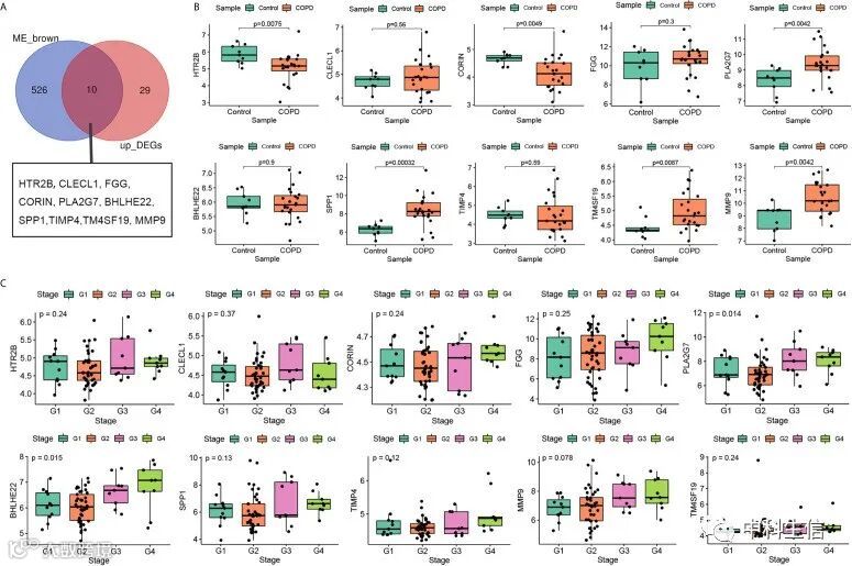 为了准确筛选稳定的hub基因,选择了棕色模块和DEGs共有的DEG(图4A),包括 HTR2B、CLECL1、FGG、CORIN、PLA2G7、BHLHE22、SPP1、TIMP4、TM4SF19和MMP9。这10个基因的表达水平首先在GSE38974中得到验证。如图4B所示,COPD肺组织中HTR2B和CORIN的表达水平显着低于对照组;COPD肺组织中PLA2G7、SPP1、TM4SF19和MMP9的表达水平显着高于对照组。接下来,在GSE69818中验证了这10个基因与GOLD分期之间的关系。如图4C所示,PLA2G7和BHLHE22的表达水平随着GOLD阶段的进展显着增加。因为PLA2G7在两个独立的数据集中显示出显着差异,所以选择PLA2G7进行后续分析。