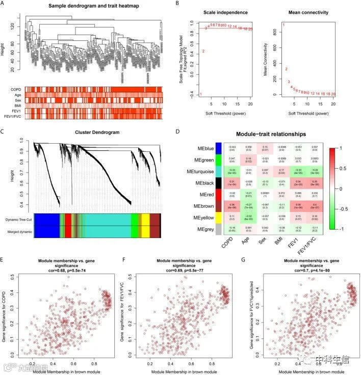 为了识别与COPD患者临床特征相关的关键基因,通过WGCNA进行共表达网络分析。从GSE76925数据集中获得临床特征(年龄、性别、BMI、FEV1/FVC和FVC1%预测值)。软阈值为3(无标度R2=0.906),height为0.25,确定了8个模块(图3A-C)。图3D-G中的结果表明,棕色模块与COPD、FEV1/FVC和FVC1%相关性较大。