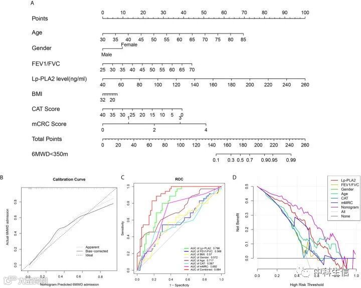 我们将年龄、分级、FEV1/FVC、BMI、CAT评分和mMRC评分等传统临床特征与Lp-PLA2水平相结合,构建了预测COPD患者运动耐量受损(6MWD<350 m)的列线图模型(图7A)。校准图证实了我们模型的性能(图7B)。为了证明列线图模型的临床优势,我们将单个变量的ROC曲线与列线图曲线进行了比较。列线图模型具有最高的AUC值(图7C)。最后,使用决策曲线分析(DCA)来确认调查结果。与单个临床变量相比,组合列线图模型显示了6MWD<350m预测的最高功效(图7D)。这些方法证实了我们的列线图模型的临床实用性。