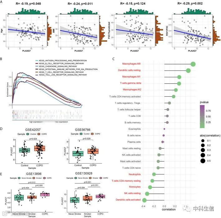 分析PLA2G7与COPD患者临床特征的关系。如图5A 所示,年龄、BMI和FEV1/FVC与PLA2G7表达呈负相关。为了阐明PLA2G7在COPD中的潜在调控机制,使用GSE76925数据集进行GSEA分析。如图5B所示,免疫相关通路 “ANTIGEN PROCESSING AND PRESENTATION”, “B CELL RECEPTOR SIGNALING PATHWAY”, “CHEMOKINE SIGNALING PATHWAY”, “INTESTINAL IMMUNE NETWORK FOR IGA PRODUCTION”, “T CELL RECEPTOR SIGNALING PATHWAY” 和“TOLL LIKE RECEPTOR SIGNALING PATHWAY” 在PLA2G7高表达组中富集。因此,我们分析了免疫浸润与PLA2G7表达之间的关系。如图5C所示,macrophages M0、 dendritic cells resting 、macrophages M1、T cells gamma delta和macrophages M2与PLA2G7表达呈正相关;neutrophils、T cells CD4 memory resting、Monocytes、NK cells resting和dendritic cells activated与PLA2G7表达呈负相关。