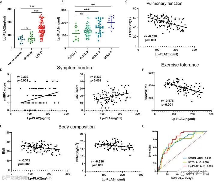 我们分析了Lp-PLA2水平与CAT和mMRC评分之间的关系。如图6D 所示,Lp-PLA2水平与mMRC评分和CAT评分呈正相关。如图6E所示,Lp-PLA2水平与BMI和FFMI呈负相关。总的来说,这些发现表明Lp-PLA2显着增加与疾病进展相关,并且是COPD患者的重要生物标志物。