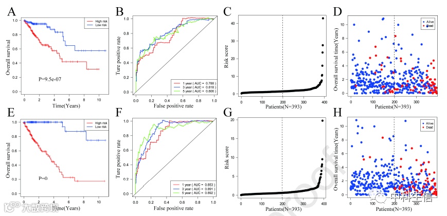 单因素和LASSO回归分析分别构建lncRNA和mRNA风险模型,Kaplan–Meier生存曲线和ROC曲线对风险模型进行评估。