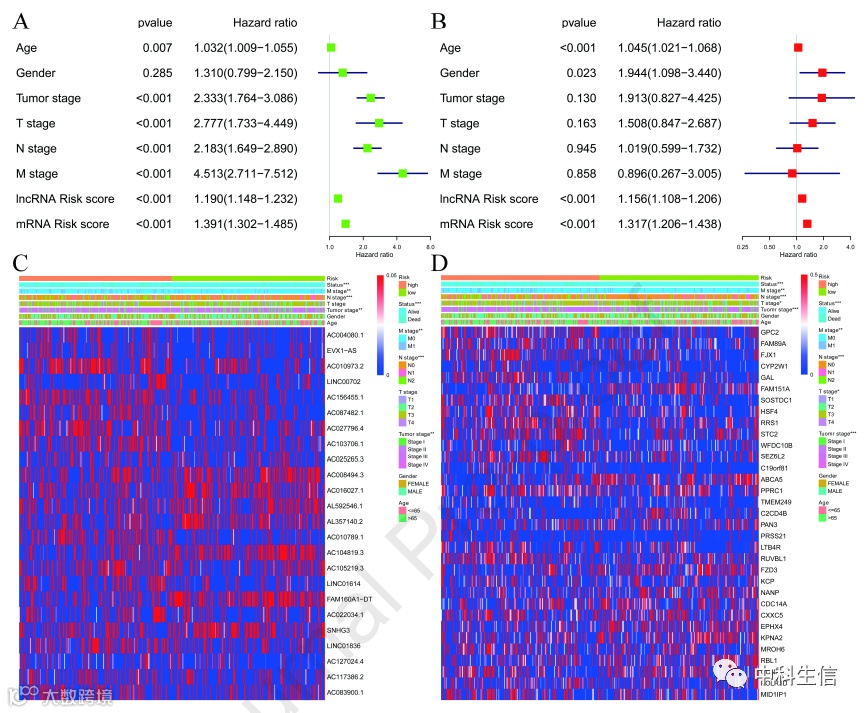 我们进行了单因素和多因素Cox回归分析,进一步确定m6A相关lncRNA和mRNA风险评分是否能准确预测CRC患者的预后。结果显示,m6A相关的lncRNA和mRNA签名与OS显著相关,多因素Cox分析显示是OS的独立预后因素。