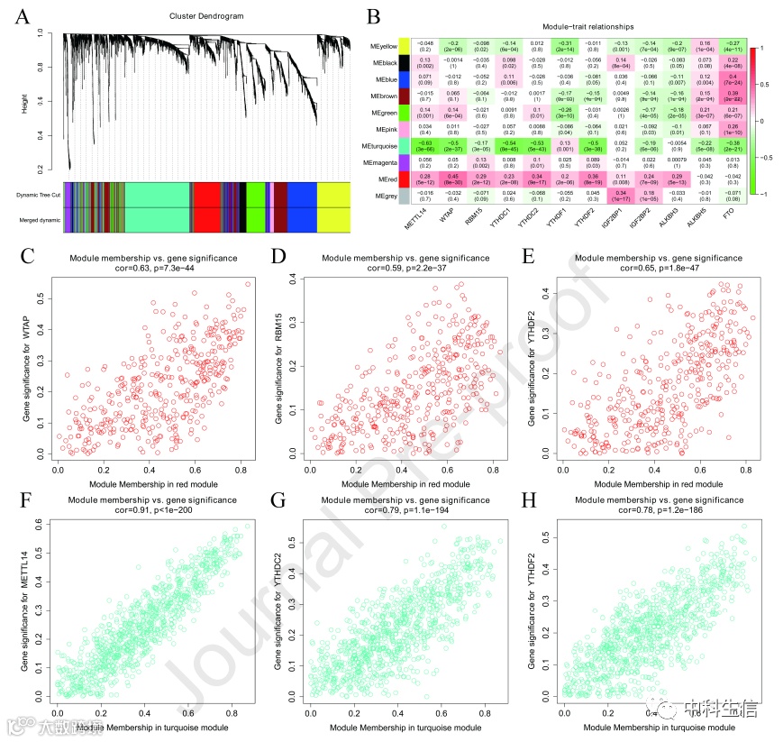 通过WGCNA,我们确认了6个lncRNA共表达模块,并评估了它们与12个os相关的m6A RNA甲基化调控因子的相关性。三个模块共涉及544个lncRNA,我们将这些与m6A调控相关的lncRNA定义为m6A相关的lncRNA。对于mRNA,鉴定出10个模块进行进一步分析。两个模块中的1292个mRNA被认为是m6a相关的mRNA。