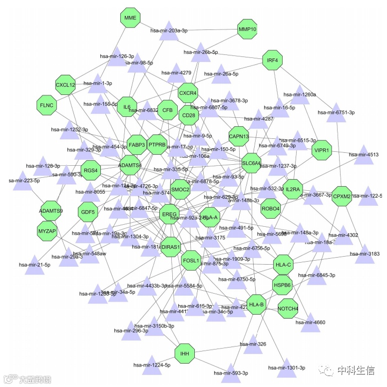 为了识别在转录水平发生的实质性变化,并深入了解中心蛋白的调控分子或常见的DEGs,我们采用了基于网络的方法来解码调控转录因子和miRNAs。TFs调节因子与共同的DEGs相互作用如图7所示。同样,图8显示了mirna调控因子与共同的基因差异基因的相互作用。从TFs -基因和miRNAs -基因相互作用网络分析中,确定了112个转录因子(TFs)和68个转录后(miRNAs)调控信号具有不止一种共同的DEGs,这从本质上说明它们之间存在强烈的干扰。