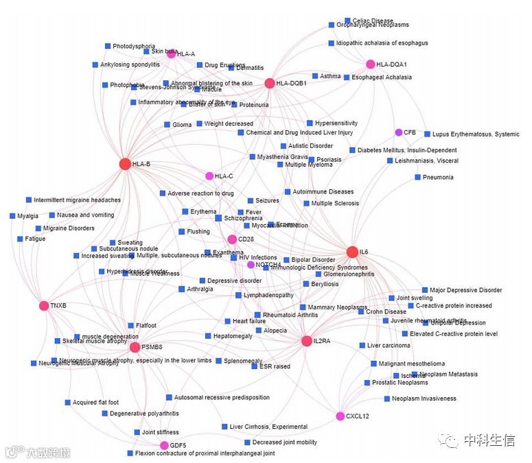 不同疾病相互关联的条件是它们通常必须有一个或多个相似的基因。疾病治疗设计策略开始揭示基因和疾病之间的关系。通过NetworkAnalyst对基因-疾病关联的分析,我们注意到类风湿关节炎、精神分裂症、疹子、特应性皮炎和常染色体隐性易感疾病与我们报道的中枢基因最为协调,甚至在IPF、COPD和COVID-19中也是如此。精神分裂症是一种复杂的疾病,包括其病理生理中多种路径的失调。谷氨酸能、多巴胺能和氨基丁酸能神经递质系统正在影响精神分裂症疾病,这些受体之间的相互作用有助于疾病的病理生理学。特应性皮炎的病理生理学是多因素和困难的,包括IgE介导的超敏反应、屏障功能障碍的因素、细胞改变和环境因素。基因与疾病之间的关系如图9所示。