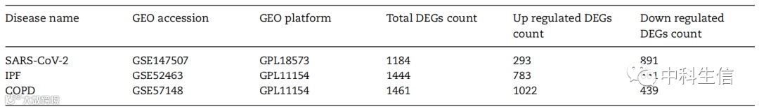 为了确定SARS-CoV-2、IPF和COPD之间共享的遗传相互关系,我们使用了来自美国国家生物技术信息中心(NCBI)的GEO数据库中的微阵列和RNA-seq数据集。SARS-CoV-2数据集的GEO accession ID为GSE147507,这是通过Illumina NextSeq 500高通量测序平台提取RNA序列对COVID-19肺活检响应呼吸道感染的转录谱分析。IPF数据集是人类肺组织(GEO accession ID: GSE52463),包含8个IPF肺样本和7个健康对照,由Nance等人贡献的名为Illumina HiSeq(智人)的高通量测序系统进行测序。GEO ID: GSE57148的COPD数据集收集自91名肺活量测量正常的受试者和98名COPD受试者。通过Cufflinks软件检测基因表达,使用HiSeq 2000和RNA-seq对从COPD样本中分离的RNA进行检测。数据集的汇总信息如表1所示。
