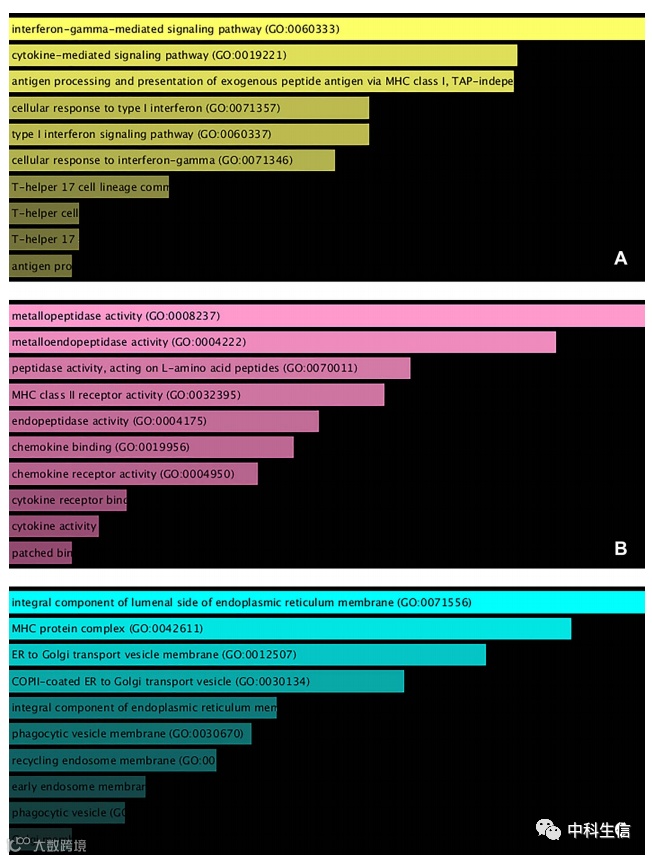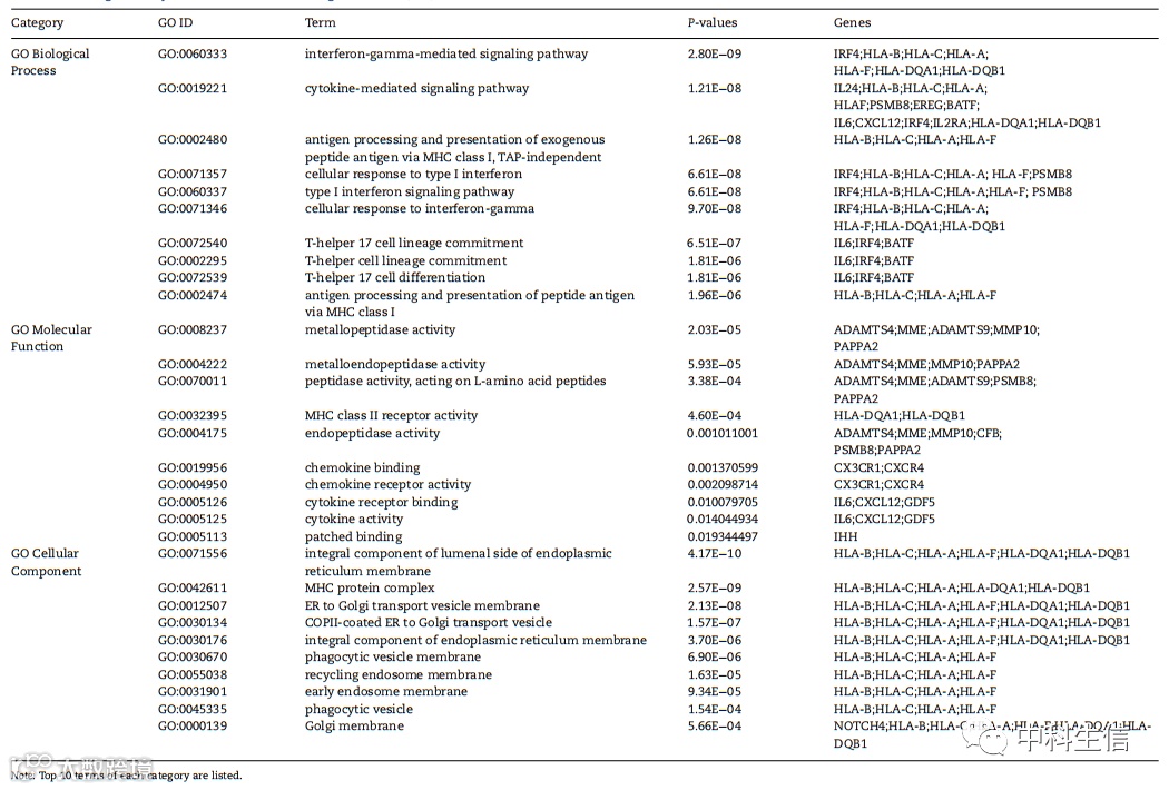 利用Enrichr软件进行GO与通路富集分析,确定本研究中所强调的富集途径共享的DEGs的生物学意义。GO考虑了基因功能及其组成部分,提供了丰富的可计算知识资源。GO在给定的上下文中定义了一组信息——理论上讲。从生物过程、细胞成分和分子功能三个类别获取GO,并选择GO数据库作为注释源。表2总结了生物过程、分子功能和细胞成分类别中的前10个术语。图3还在柱状图中线性地描述了每个类别的整体GO分析。