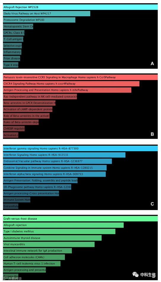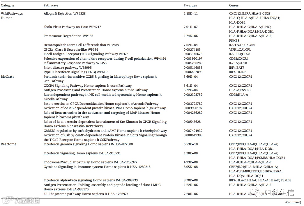 基因集富集分析是一项重要的分析。利用enrichment(一种综合性的基因集富集网络工具)进行基因本体、功能富集(生物过程、细胞成分和分子功能)和通路富集研究,以表征共享的DEGs的生物学机制和信号通路。目前,我们以KEGG (Kyoto Encyclopedia of Genes and Genomes)、WikiPathways、Reactome和BioCarta 4个数据库作为路径分类的起点,明确IPF、COPD和COVID-19之间的共享路径。通常,已知KEGG通路可以掌握代谢过程,并在基因组分析中发挥相当大的作用。P值< 0.05被认为是量化排名前几位途径的标准度量。