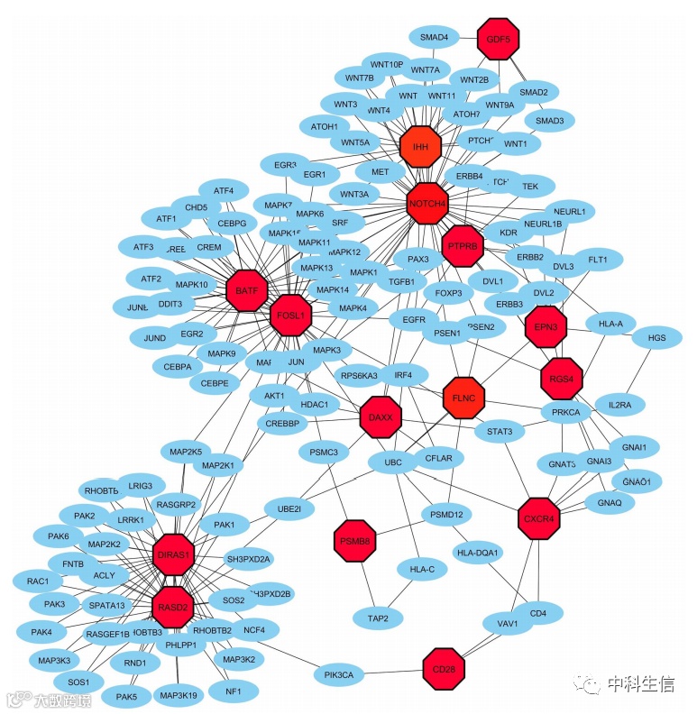 我们仔细研究了来自STRING的PPI网络,并在Cytoscape中可视化,以预测常见的DEGs相互作用。常见DEGs的PPI网络由781个节点和968条边组成,如图5所示。同时,大多数相互连接的节点被认为是PPI网络的中心基因。从包含Cytohubba插件的PPI网络分析中,我们列出了最具影响力的14个(21.54%)基因。hub基因分别为NOTCH4、FLNC、Indian hedgehog (IHH)、FOSL1、CXCR4、PSMB8、DAXX、RASD2、EPN3、DIRAS1、BATF、GDF5、RGS4和CD28。这些中枢基因可能是潜在的生物标志物,这也可能导致新的治疗策略的研究疾病。由于中心基因是有潜力的,在Cytohubba插件的帮助下,我们还构建了一个子模块网络(图6),以更深入地了解它们的近连通性和邻近性。从PPI网络衍生出的hub-gene相互作用扩展网络如图6所示。