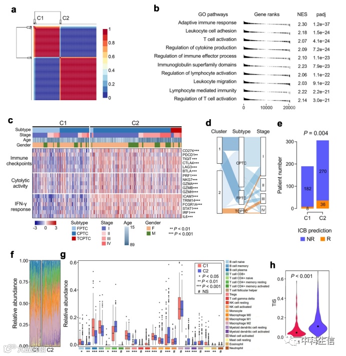 基于 307 个 PTC 特异性 IRG 的表达矩阵,TCGA PTC 队列(n = 496)被分为两个不同的免疫簇(C1 和 C2),GSEA 分析表明,与 C1 相比,C2 表现出显著更高的各种免疫过程的活性,并且在 Gene Ontology 的所有基因组中,最显著改变的途径表现为“适应性免疫反应”。综合热图说明了两个集群之间的临床病理特征、免疫检查点、细胞溶解活性特征和 IFN-γ 反应特征的差异。桑基图描绘了从两个免疫簇到不同变异和病理阶段的流动,其中流速的宽度与患者数量成正比,所有高细胞变异 PTC (TCPTC) 样本都被归类为 C2,而大多数滤泡变异 (FPTC) 样本被归类到 C1。此外,应用 TIDE 算法来评估每个 PTC 样本的潜在 ICB 响应,响应者的比例在 C2 中显著升高,堆叠条形图说明了两个免疫簇中 22 种免疫细胞类型的相对丰度的不同模式,巨噬细胞 M2 在所有免疫细胞中所占比例最高。与 C1 相比,C2 的 T 细胞浸润评分(TIS)显著升高。这些证据表明两个免疫簇之间的内在肿瘤免疫原性和潜在的免疫治疗反应存在显著差异。