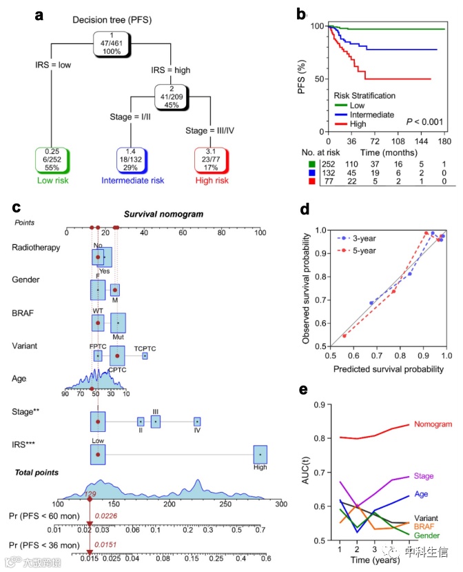 接下来,通过 IRS 和其他临床病理学特征的组合提出了一个综合预后模型,以改善风险分层和个性化风险评估。首先进行递归分区分析,构建生存决策树,优化风险分层。具体而言,低IRS患者被定义为“低风险”组,而“中风险”和“高风险”组被定义为“高IRS&I/II期”和“高IRS&III/IV期”,分别。在三个风险亚组中观察到 PFS 的显著差异。为了量化个体 PTC 患者的风险评估,生成了个性化评分列线图,以使用七个参数预测 3 年和 5 年 PFS 概率。总体而言,集成的预后模型可以极大地优化风险分层并准确预测 PTC 患者的 PFS。