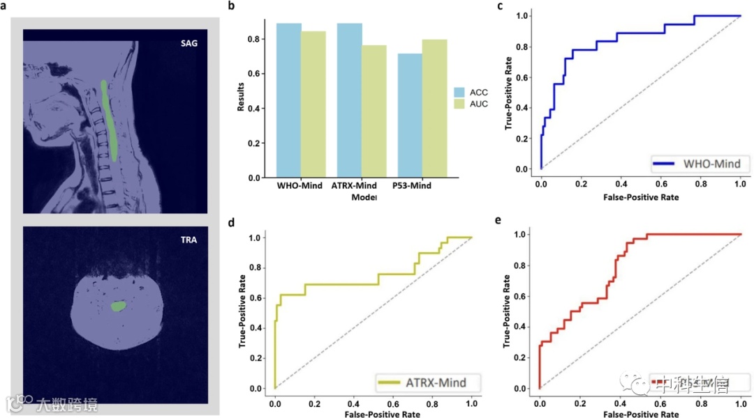 选择表现最好的模型(即WHO-Mind、ATRX-Mind和P53-Mind)进行外部测试。多模态融合特征表示被送入每个模型,即SAG+TRA+临床指标。Swin变换器的自动分割效果显示在图6a中。发现这能以相对准确的方式分割病变区域。模型在每个测试任务中的表现如图6b所示。WHO-Mind达到了最高的AUC(0.8431),而WHO-Mind和ATRX-Mind都获得了最高的Acc(0.8889)。此外,还绘制了三个模型的ROCs,以更详细地显示它们的泛化性能(图6c-e)。