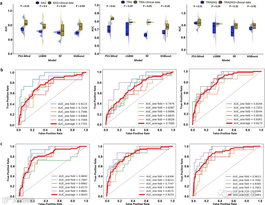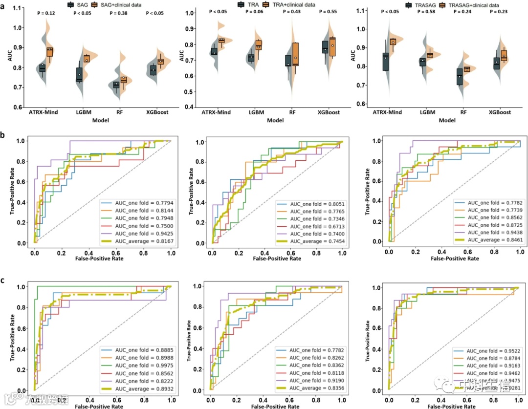 每个预测任务都训练了四个机器学习模型,每个模型都被送入六个特征表示。所有模型在实验中都进行了参数优化,这有利于性能比较。图3显示了所提模型的WHO肿瘤等级预测结果和ROC曲线。在四个模型中,WHO-Mind获得了最好的平均ROC曲线下面积(AUC;0.9263),AUC高于XGBoost(0.8802)、LightGBM(0.9079)和RF(0.8618),表明神经网络结构在该预测任务中的优势。然而,输入放射组学特征与临床基线特征相结合比只输入放射组学特征要好,表现最好的组合是SAG+TRA+临床指标。值得注意的是,我们在执行ATRX和P53突变状态的预测任务时发现了类似的结果,这可能是由于多模态融合所涵盖的特征种类较多。每个模型的ATRX和P53突变的预测结果分别显示在图4和图5。提出的ATRX-Mind和P53-Mind模型的表现优于比较的模型,其中最高的AUCs分别为0.9281和0.9173。