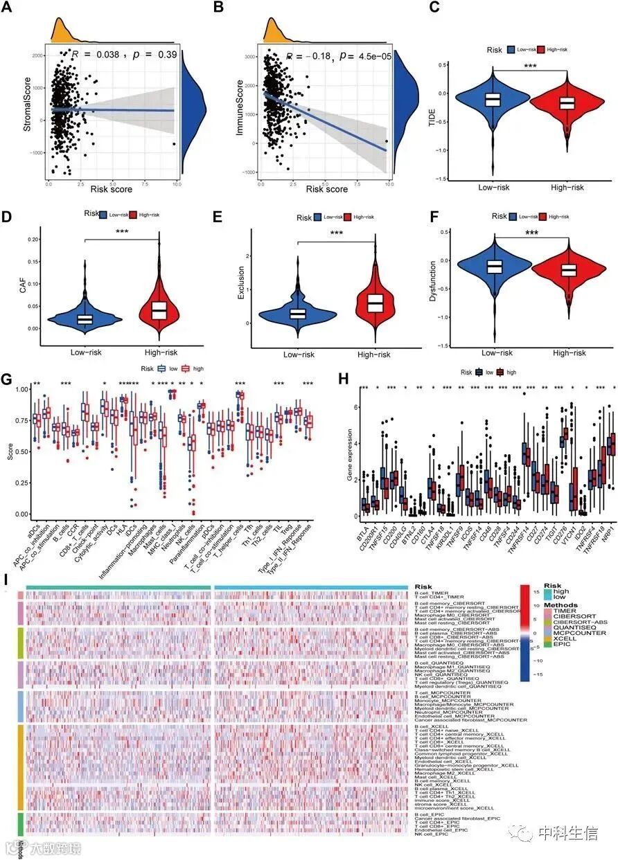 免疫分析显示低风险组具有更好的免疫状态。虽然免疫细胞的ESTIMATE评分与风险评分之间存在负相关,但基质细胞的ESTIMATE评分与风险评分之间存在正相关。接下来,比较了两个患者组的免疫细胞评分。总的TCGA队列显示,低风险组的大多数免疫细胞浸润评分高于高风险组。免疫检查点抑制剂分析显示了CTLA4、CD28、ID02和CD27在两组间存在显着差异。接下来使用TIDE评估了免疫疗法在两个患者组中的潜在治疗效果。结果高风险组患者的TIDE评分低于低风险组患者,这表明高风险患者可能对免疫检查点抑制剂治疗反应更好。此外,我们发现高风险组的CAF和T细胞排除评分更出色,而低风险组的T细胞功能障碍评分更高(图9)。