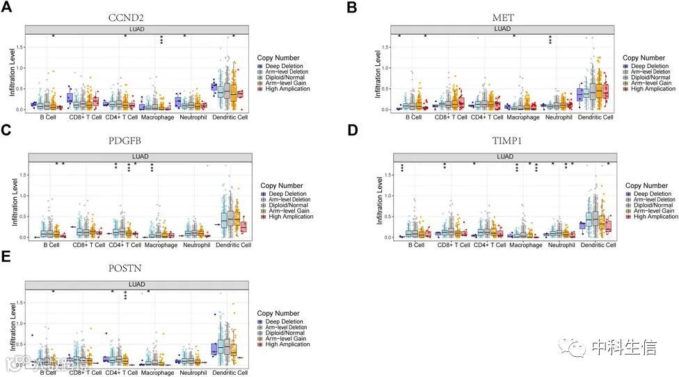 与二倍体/正常组相比,基因拷贝数变异可能影响免疫细胞浸润。由于数据库中没 PECAM1,我们分析了其余5种细胞类型的免疫细胞拷贝数变异。MET拷贝数变异与三种免疫细胞类型(B细胞、中性粒细胞和巨噬细胞)水平降低显着相关,POSTN拷贝数变异与三种免疫细胞类型(B细胞、CD4 + T细胞和巨噬细胞相关),TIMP1 拷贝数变异与六种免疫细胞类型(B细胞、CD4 + T细胞、CD8 + T细胞、中性粒细胞、CD4 + T细胞、CD8 +T细胞、中性粒细胞、巨噬细胞和树突状细胞相关),PDGFB拷贝数变异与三种免疫细胞(B细胞、CD4 + T细胞和巨噬细胞)水平下降显着相关,CCND2拷贝数变异与五种免疫细胞(B细胞、CD4 + T细胞、中性粒细胞、巨噬细胞和树突状细胞)水平下降显着相关。这些结果表明模型基因拷贝数的变化可以显着调节免疫细胞浸润(图10)。