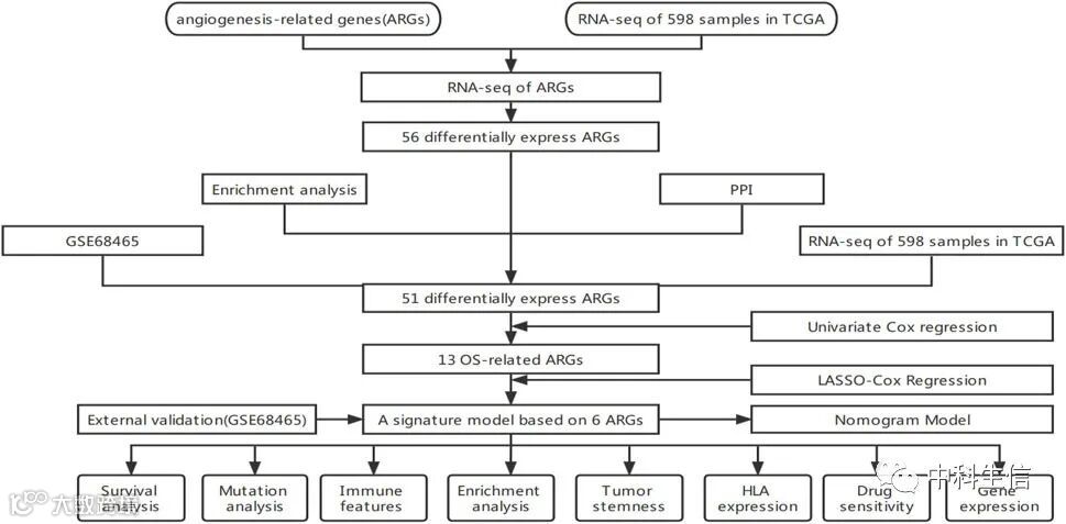 上午好!今天小编和大家一起分享一篇今年1月发表在Frontiers in Immunology杂志(IF: 6.786)的文章《Application of an angiogenesis-related genes risk model in lung adenocarcinoma prognosis and immunotherapy》。这项工作使用TCGA的综合全基因组基因表达谱来识别与肺癌预后密切相关的血管生成相关基因(AGR)。构建并验证了肺腺癌的诊断、预后和复发模型以及相应的列线图。来自GEO的相应数据进一步验证了这些结果。该研究的流程图如图1所示。