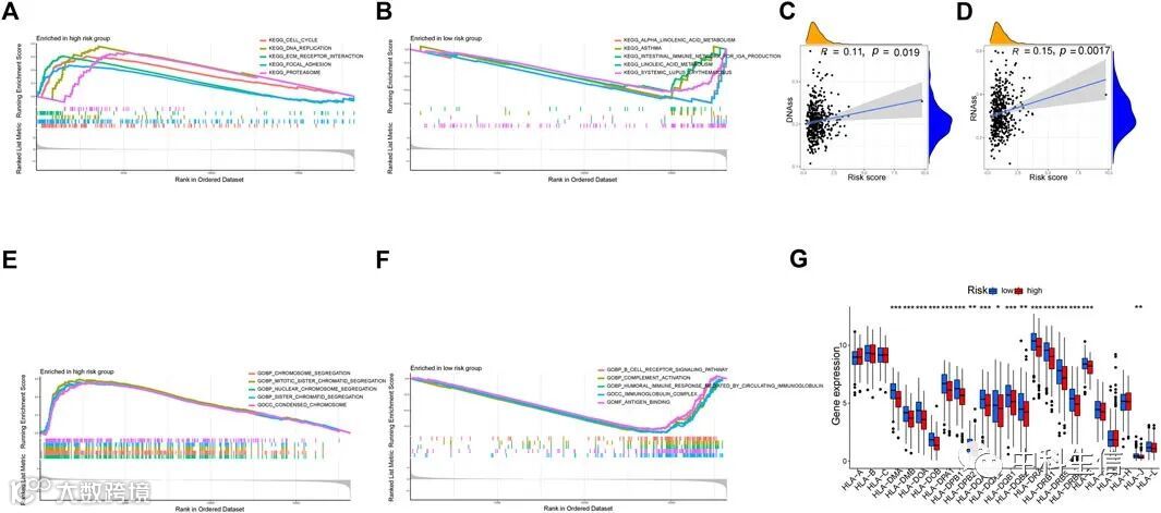 使用DNAs和RNAs来比较不同风险模式中的肿瘤干性。结果表明风险评分与DNAs(r = 0.11,p = 0.019)和RNAs(r = 0.15,p = 0.0017)值之间呈正相关。根据KEGG,高风险组富集的通路包括细胞周期、DNA复制、蛋白酶体和粘着斑,而低风险组富集的通路包括哮喘、亚油酸代谢、系统性红斑狼疮和α-亚麻酸代谢。此外,GO显示低风险组中的基因参与补体激活、抗原结合、免疫球蛋白复合物和其他过程,而高风险组中的基因富集于染色体分离、浓缩染色体和核染色体分离。高风险和低风险组之间与抗原呈递相关的HLA表达存在显着差异。在整个TCGA队列中,低风险组中许多HLA I类和II类的表达比高风险组更显着(图11)。