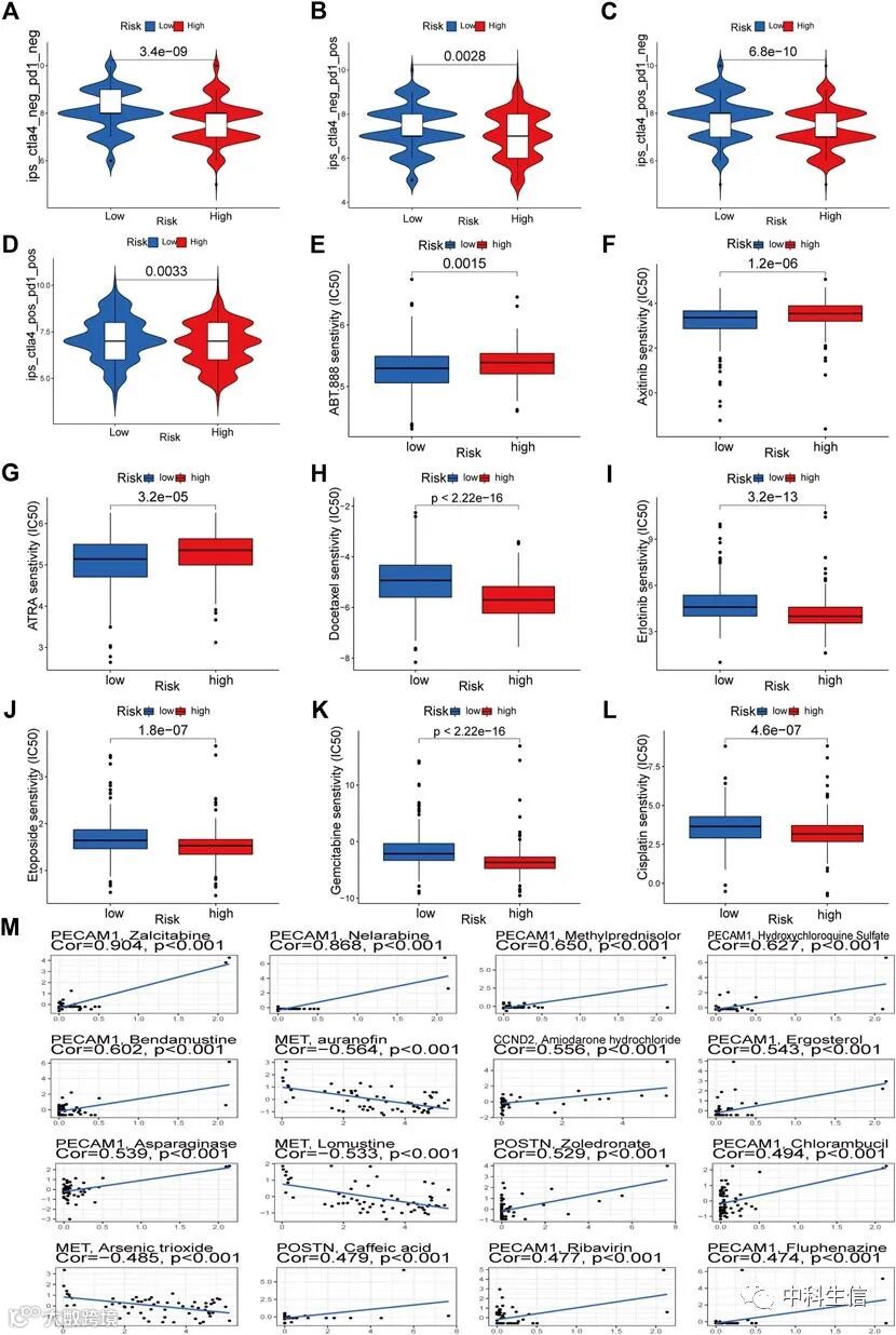 TCIA结果表明,高风险组比低风险组更可能对CTLA4阳性/PD-L标志物阳性治疗产生反应。高风险组患者对多西紫杉醇、厄洛替尼、依托泊苷、吉西他滨和顺铂的反应更灵敏,与低风险组患者相比,其较低的IC50证明了这一点。高风险组中ABT.888、axitinib和ATRA的IC50高于低风险组。研究检查了NCI-60细胞系中六个特征基因与药物有效性之间的关联。PECAM1对苯达莫司汀和甲泼尼龙以及扎西他滨敏感,MET对金诺芬、洛莫司汀和三氧化二砷敏感,CCND2对胺碘酮盐酸盐敏感。POSTN对唑来膦酸和咖啡酸敏感(图12)。