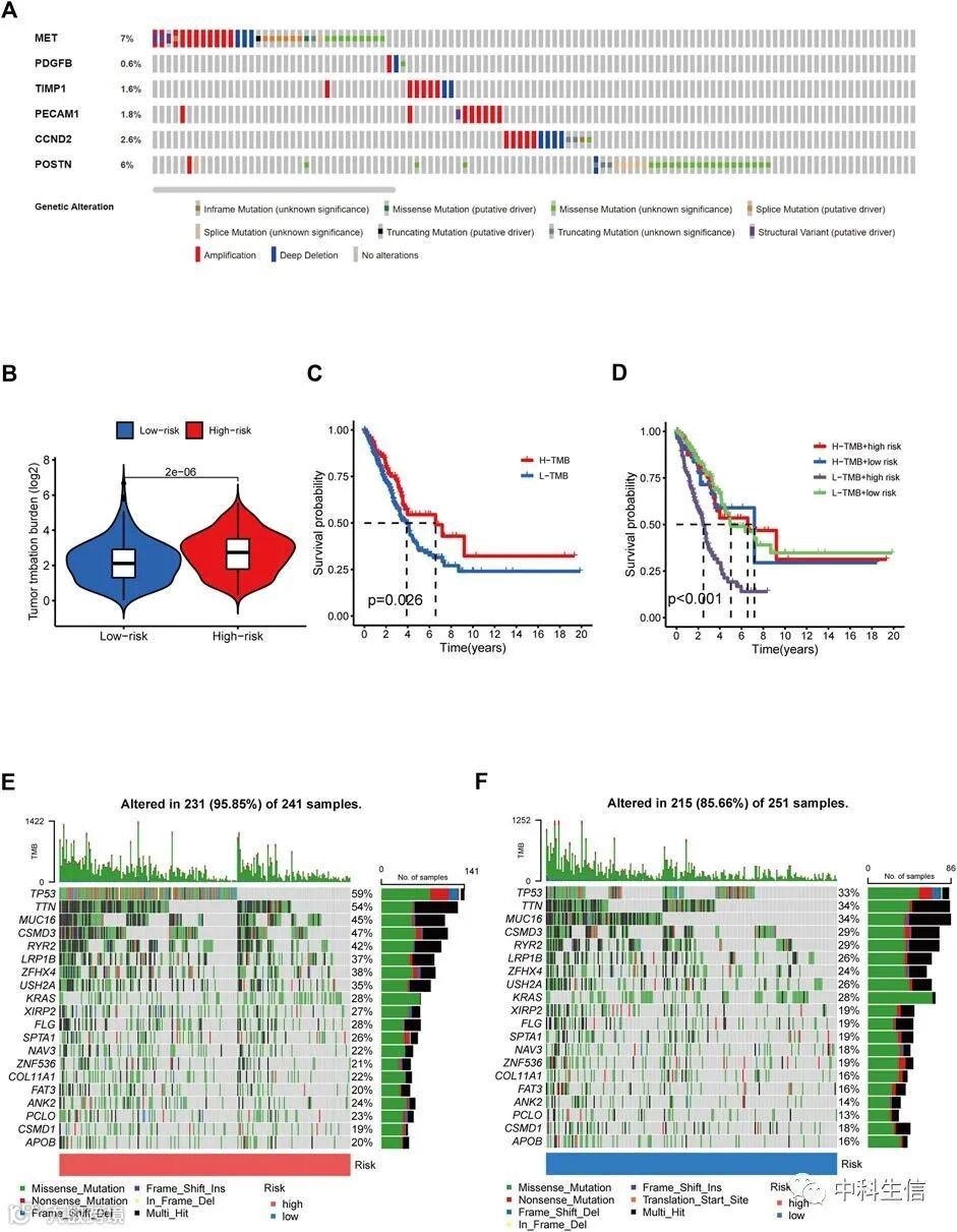 TMB在高风险组中比在低风险组中显着。然而,TMB升高的患者具有更高的生存率。Kaplan-Meier分析表明低风险评分和高TMB与更长的生存期相关。研究分析了高低风险组之间的突变率。结果显示,高风险组中的突变频率更高。高风险组中TP53和TTN突变频率也比低风险组中的更频繁。其他6个LUAD突变基因(MUC16、CSMD3、RYR2、LRP1B、ZFHX4、USH2A)也有不同程度的增加趋势。接着分析了六个血管生成基因(MET、PDGFB、TIMP1、PECAM1、CCND2、POSTN)在诊断、预后和复发模型开发中的价值。研究发现,19.6%(566个LUAD 样本)表现出基因改变,其中7% 发生在MET,其主要改变是扩增,6%的突变发生在POSTN(图8)。