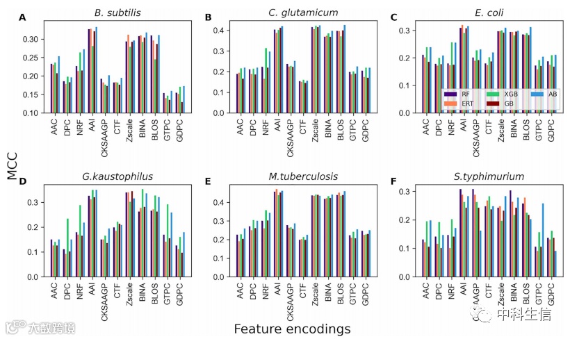 为了了解不同的特征在每个物种的最佳特征集中的贡献,我们分析了它们的组成和分布。值得一提的是,五种分类器模型对每种物种有不同的最优特征子集。我们没有关注每一个子集,而是考虑了最优特征子集的最大大小,该特征子集可能包括5个物种(枯草芽孢杆菌、谷氨酰胺C. coli、结核分枝杆菌和鼠伤寒杆菌)的其他4个子集。以谷氨酸菌为例,RF、ERT、GB、XGB和AB分别包含30、38、31、52和44D最优特征子集。在这里,52D有其他特征子集。然而,在G. kaustophilus中,不同的最优子集被组合在一起来研究它们的作用。
