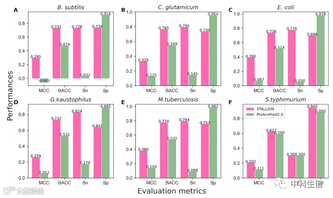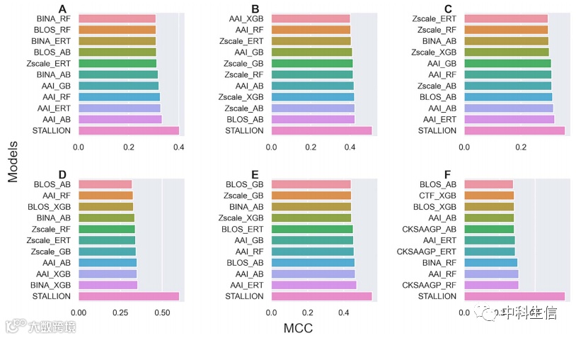 就像STALLION和最佳单特征模型的交叉验证性能比较一样,我们进行了独立测试。从图8中可以看出,STALLION的MCC优于单一特征模型,枯草芽孢杆菌的MCC比单一特征模型高2.39-10.68%,谷氨酸芽孢杆菌的MCC比单一特征模型高1.18-6.08%,大肠杆菌的MCC比单一特征模型高4.0-9.5%,考斯特氏菌的MCC比单一特征模型高2.5-8.7%,结核分枝杆菌的MCC比单一特征模型高3.51-10.89%,鼠伤寒链球菌的MCC比单一特征模型高11.29-19.54%。这些结果再次强调了我们系统方法在模型构建中的重要性。