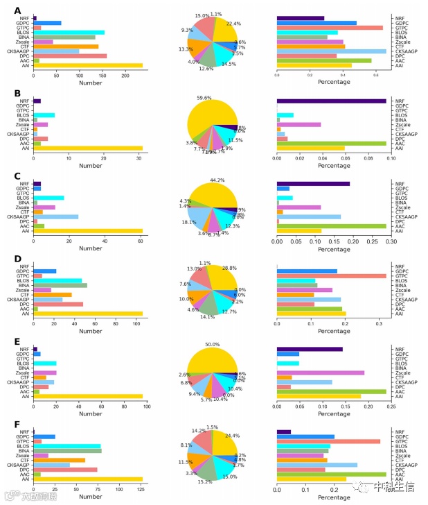 从图6可以看出,在最优特征集中,6种物种的特征分布存在显著差异;然而,也有一些微妙的相似之处。其中,AAI分别占枯草芽孢杆菌、谷氨酸芽孢杆菌、大肠杆菌、考斯特氏菌、结核分枝杆菌和鼠伤寒杆菌最优特征的22.4%、59.6%、44.2%、28.8%、50.0%和24.4%。这一结果表明AAI特征对6个物种的贡献是重要的,表明它们在Kace预测中至关重要。六种编码(AAC, DPC, CKSAAGP, CTF, Zscale和BLOS)一致贡献了所有物种的最佳特征集。尽管如此,他们之间的贡献水平不同,表明在Kace预测中发挥了支持作用。此外,我们还观察到,GTPC和gpc、GTPC、NRF和GTPC和BINA分别对谷氨酸C.谷氨酰胺、大肠杆菌、考斯特氏菌和结核分枝杆菌的最终预测没有贡献。总体而言,除AAI外,其他特征贡献在不同物种之间存在较大差异,这表明这些物种的Kace位点可能具有不同的特征。